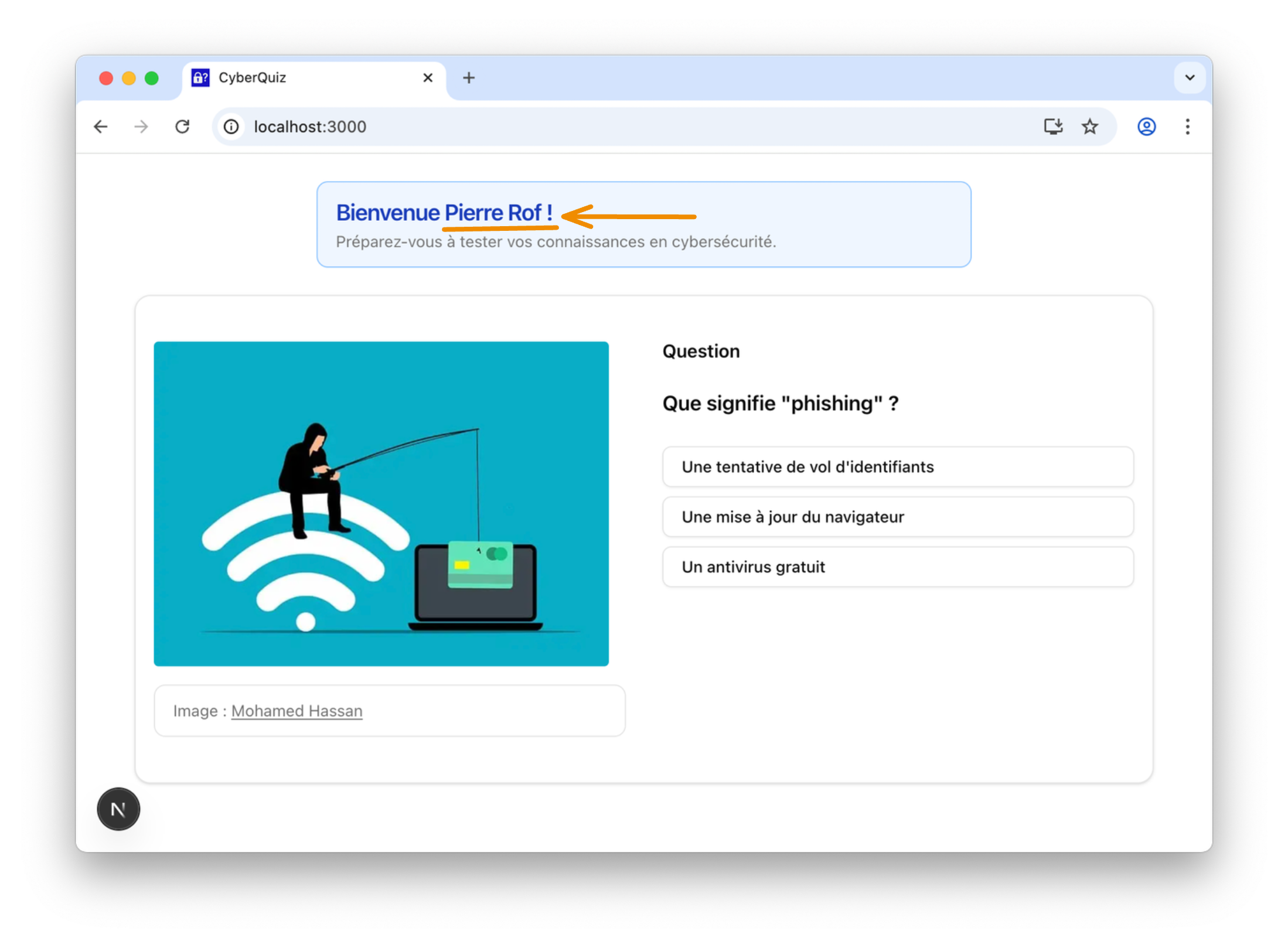 localStorage, nous allons récupérer son nom depuis Supabase et l’afficher dans l’interface du quiz, par exemple dans l’en-tête ou dans une alerte de bienvenue.