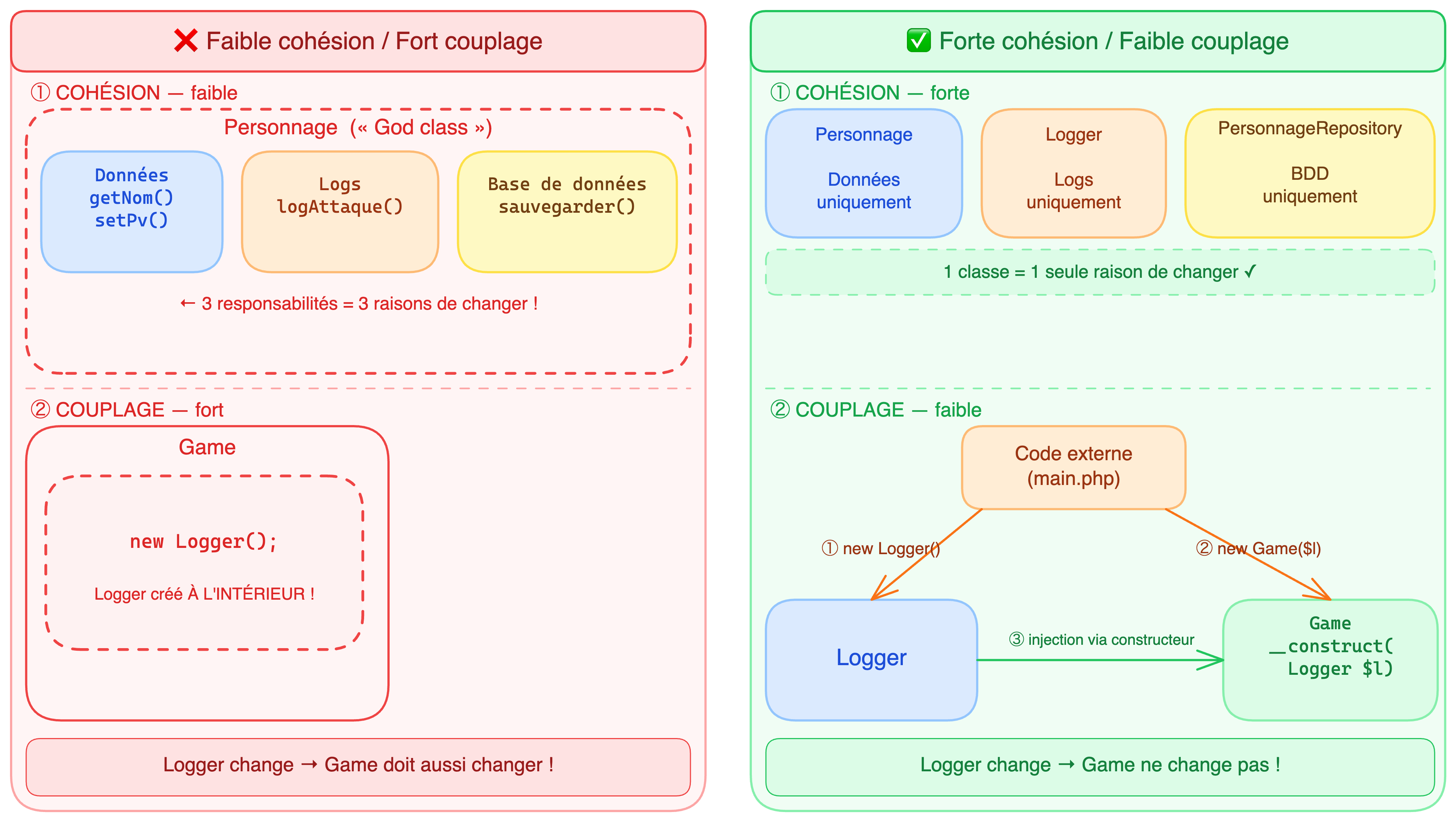 Game ne fait plus que gérer le combat (forte cohésion), et on peut remplacer Logger sans toucher à Game (faible couplage).