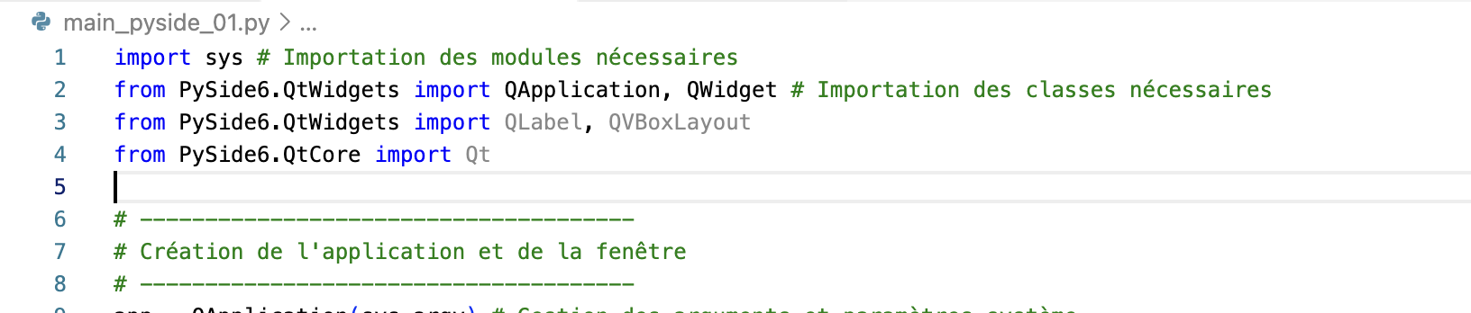 pip. - Version : Ce tutoriel utilise PySide6 (la version actuelle compatible avec Qt 6).