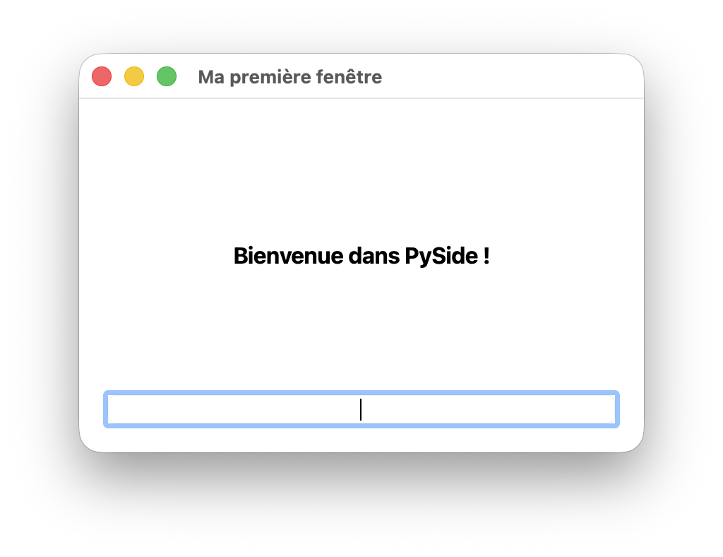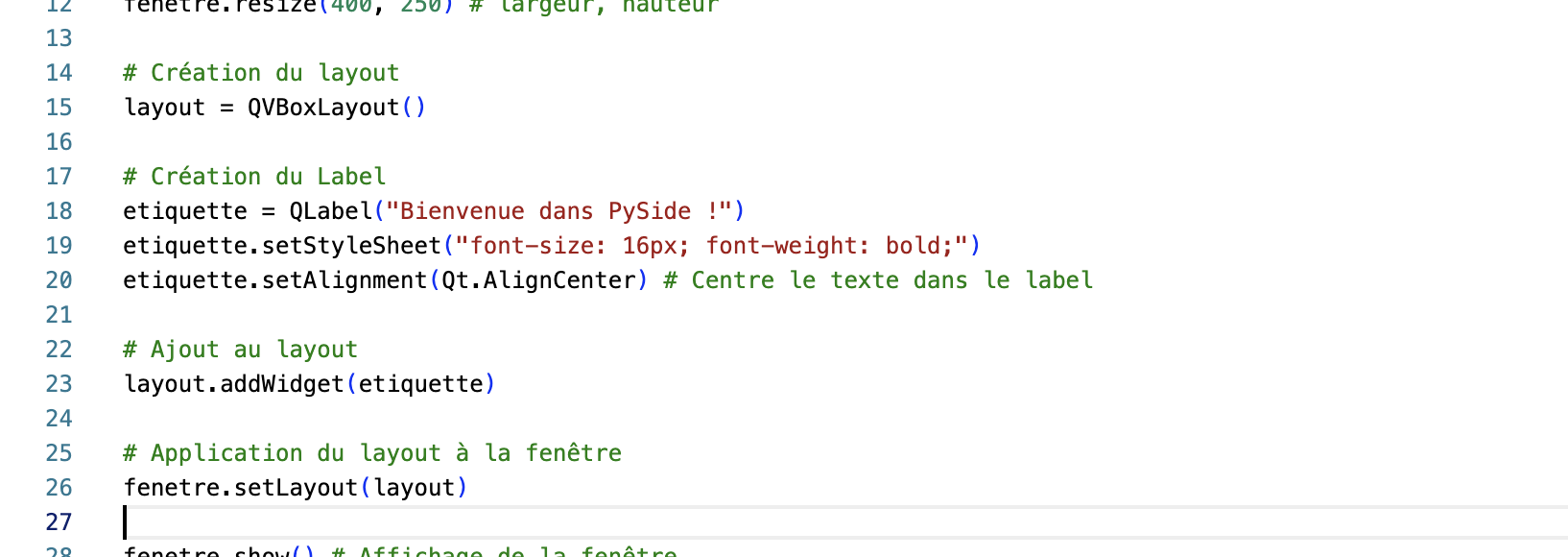 6. Ajouter une étiquette (QLabel) avec le texte "Bienvenue dans PySide !"