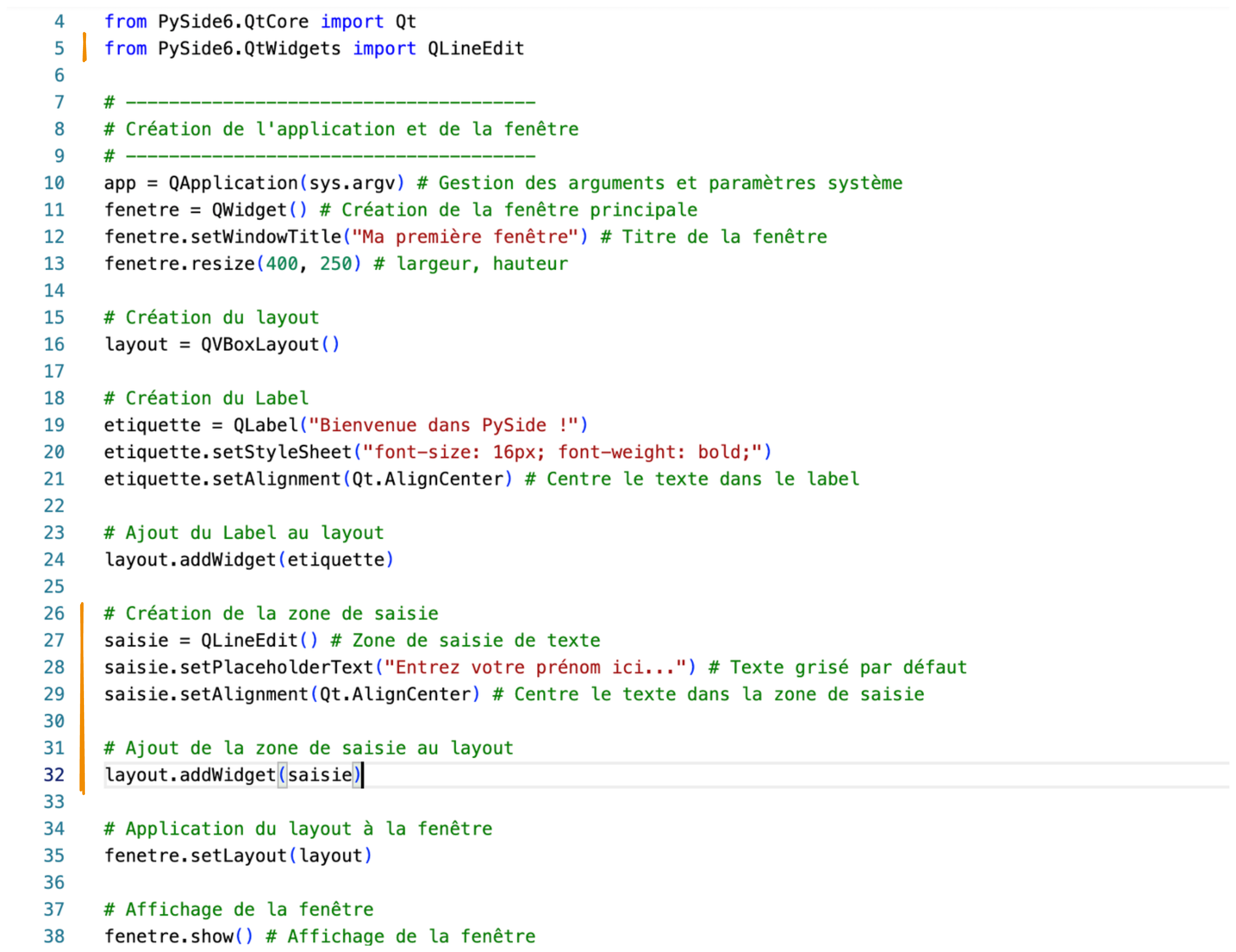 Ajoutez l'import QLineEdit et insérez le code suivant après l'ajout du label (toujours avant fenetre.setLayout(layout) :