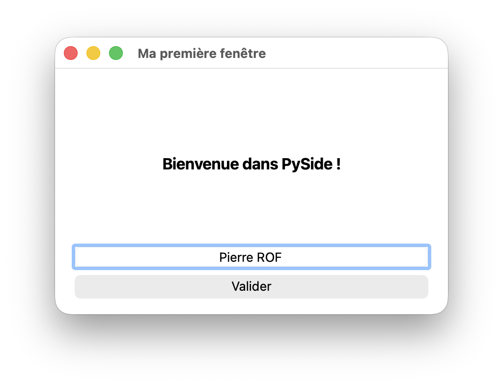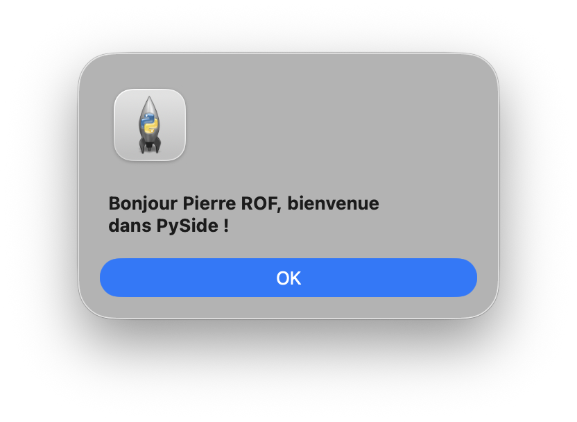 QMessageBox.information(fenetre, "Bienvenue", f"Bonjour {prenom}, bienvenue dans PySide !")